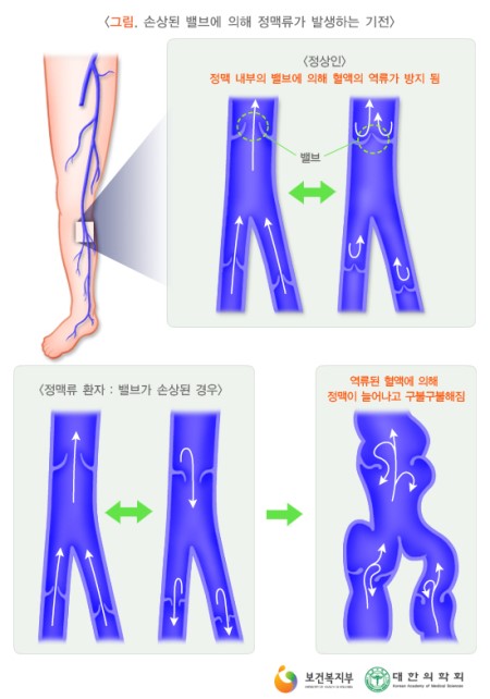 그러나 나이가 들수록 정맥 탄력이 감소하고 팽창하며, 정맥의 판막도 약해져 혈액이 역류하게 된다. 그 결과 정맥 내부의 압력이 증가하여 정맥이 팽창하여 정맥이 흐르게 된다.